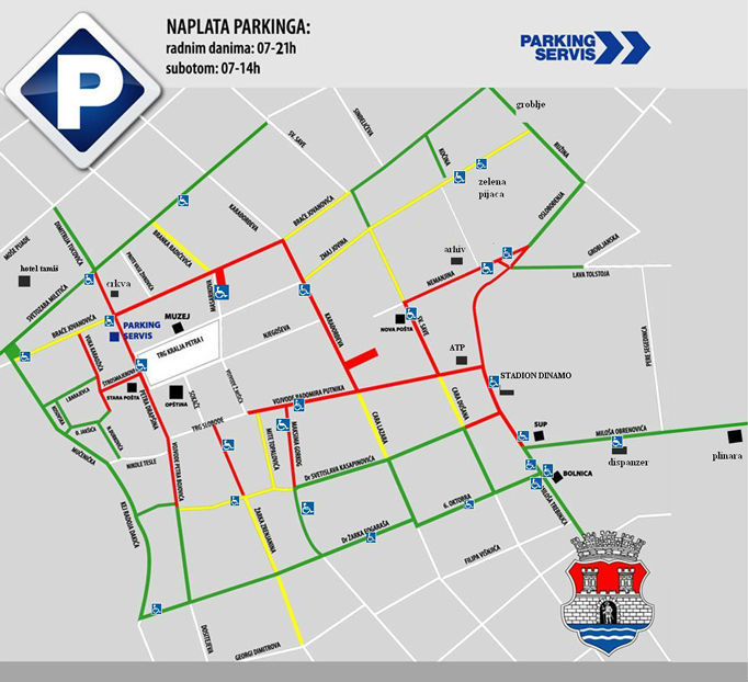 Паркинг-служба одржава паркинг-места у граду и врши наплату паркинга на јавним паркиралиштима. Паркинг-места у граду су подељена у три зоне: I, II и III; све три зоне су обухваћене СМС системом плаћања. Свака зона има и паркинг-места за возила особа са инвалидитетом.